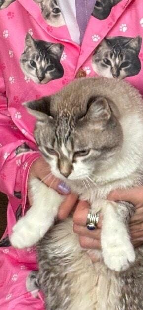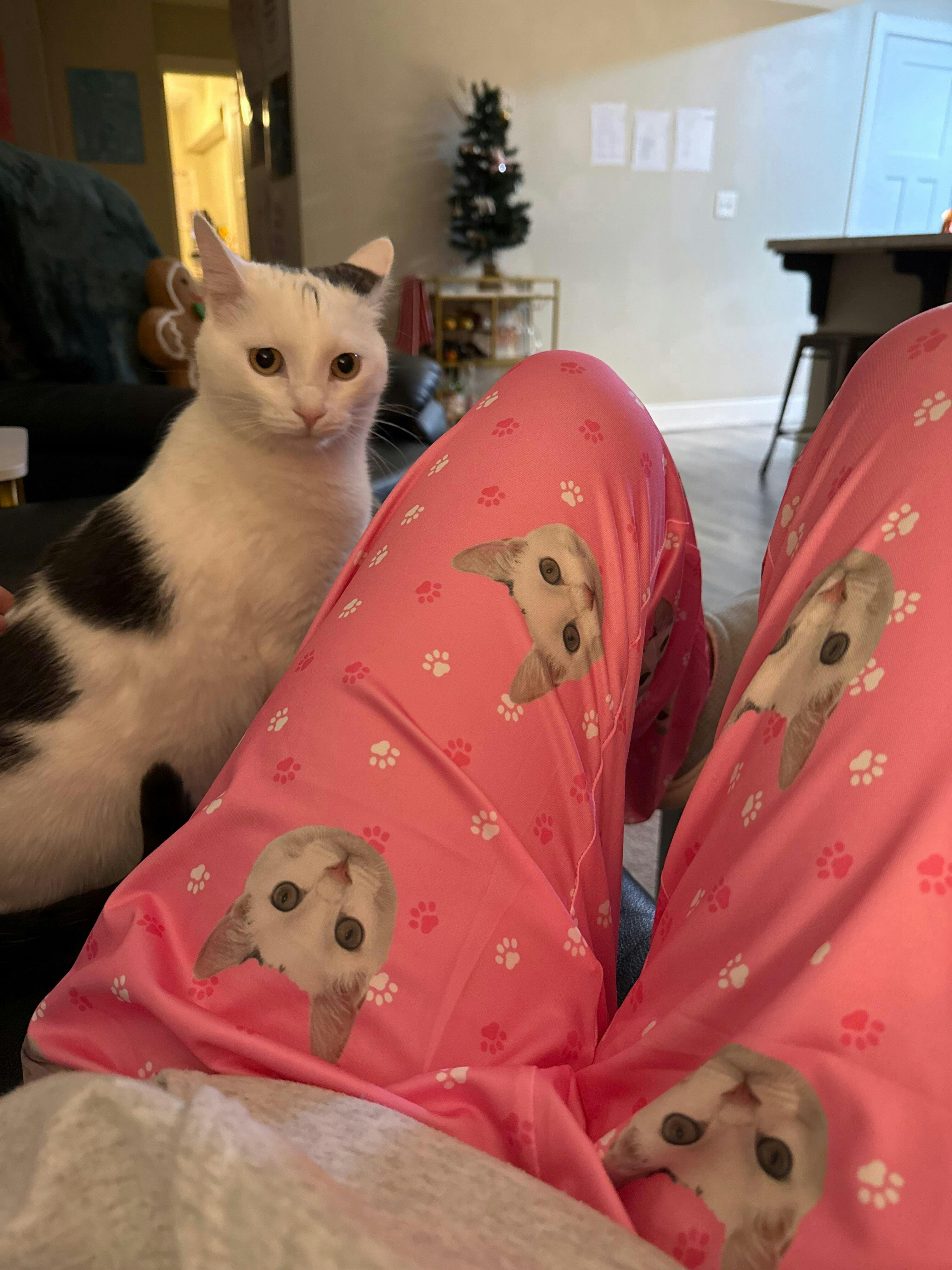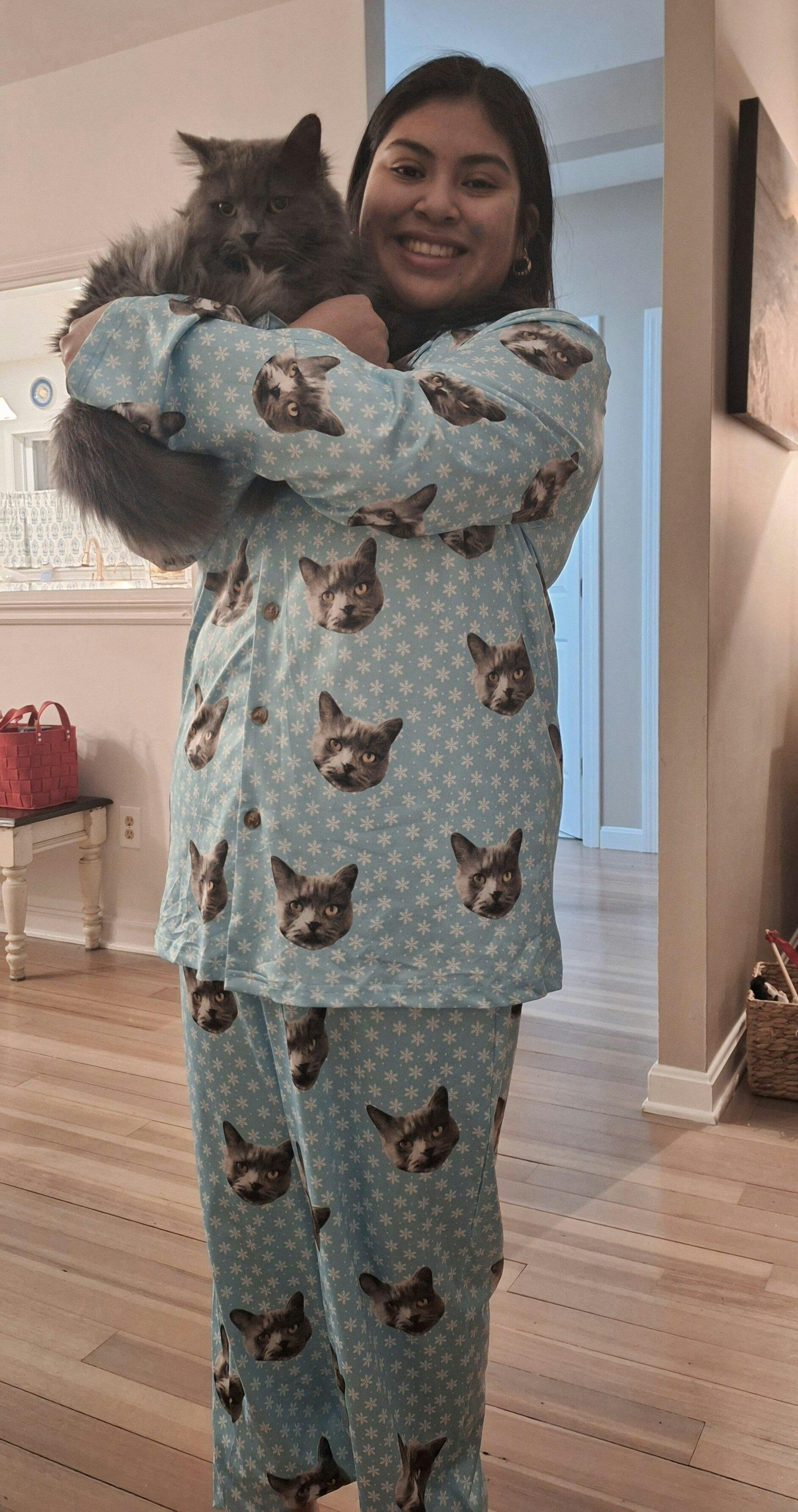 I just love my cat so I love that she can be with me at college when I'm away from home now!! Plus these pajamas are so comfy and well made.